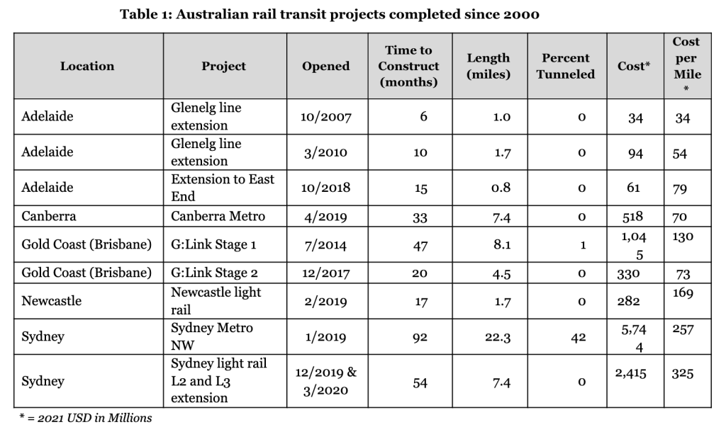 Australia’s transit projects over the past two decades have consisted primarily of at-grade light rail in its largest cities. The Canberra light rail was delivered $32 million under the original budget, with a final cost of $474 million, though it opened a half-year later than anticipated. The first stage of the Gold Coast light rail project was delivered on budget, and the second stage was completed four months ahead of schedule. While some projects, like the light rail extensions in Adelaide and the light rail in Canberra, have been built at or under international cost averages, most lines are more expensive on a per-mile basis. The Sydney light rail cost almost twice as much as originally budgeted due to scope changes and risks associated with utility relocation.