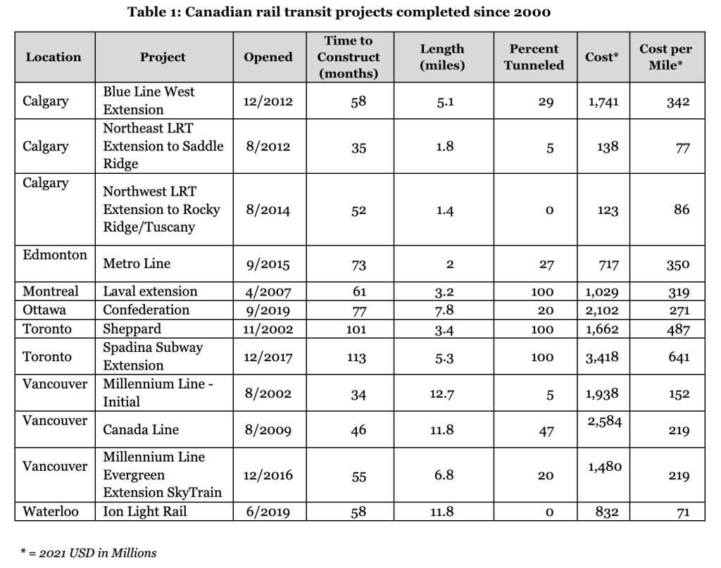 Canadian regions have delivered 12 rail transit projects over the last two decades, including tunneled extensions in Toronto and new light rail lines in Vancouver. Canadian construction costs for subways are generally higher than those in other democratic countries but are still lower than the average in the United States on a per-mile basis. At-grade construction costs are similar to those of the U.S., ranging from as low as $71 million per mile in Waterloo to $350 million per mile in Edmonton.