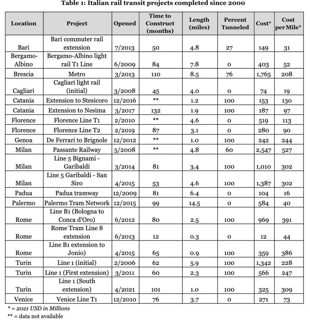 Italy has built 21 new rail line or extension projects in the past 20 years with average costs lower than the United States. The country has built tunneled projects at an average cost of $263 million per mile, and its eight at-grade tram projects have averaged $56 million per mile.